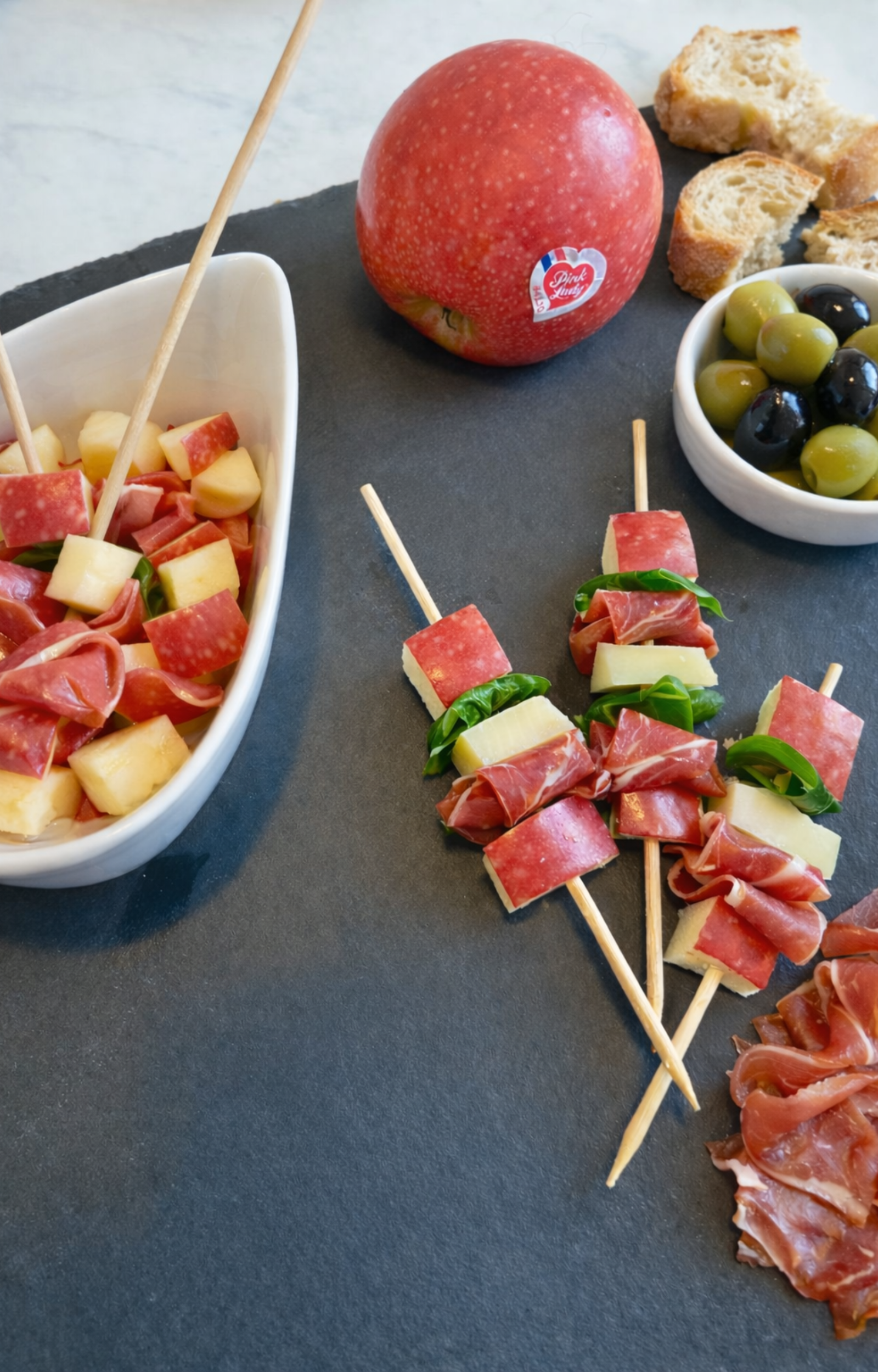 - Rijg op een spiesje een stukje appel, een blokje kaas, een plakje Serranoham en wat rucola (of veldsla).