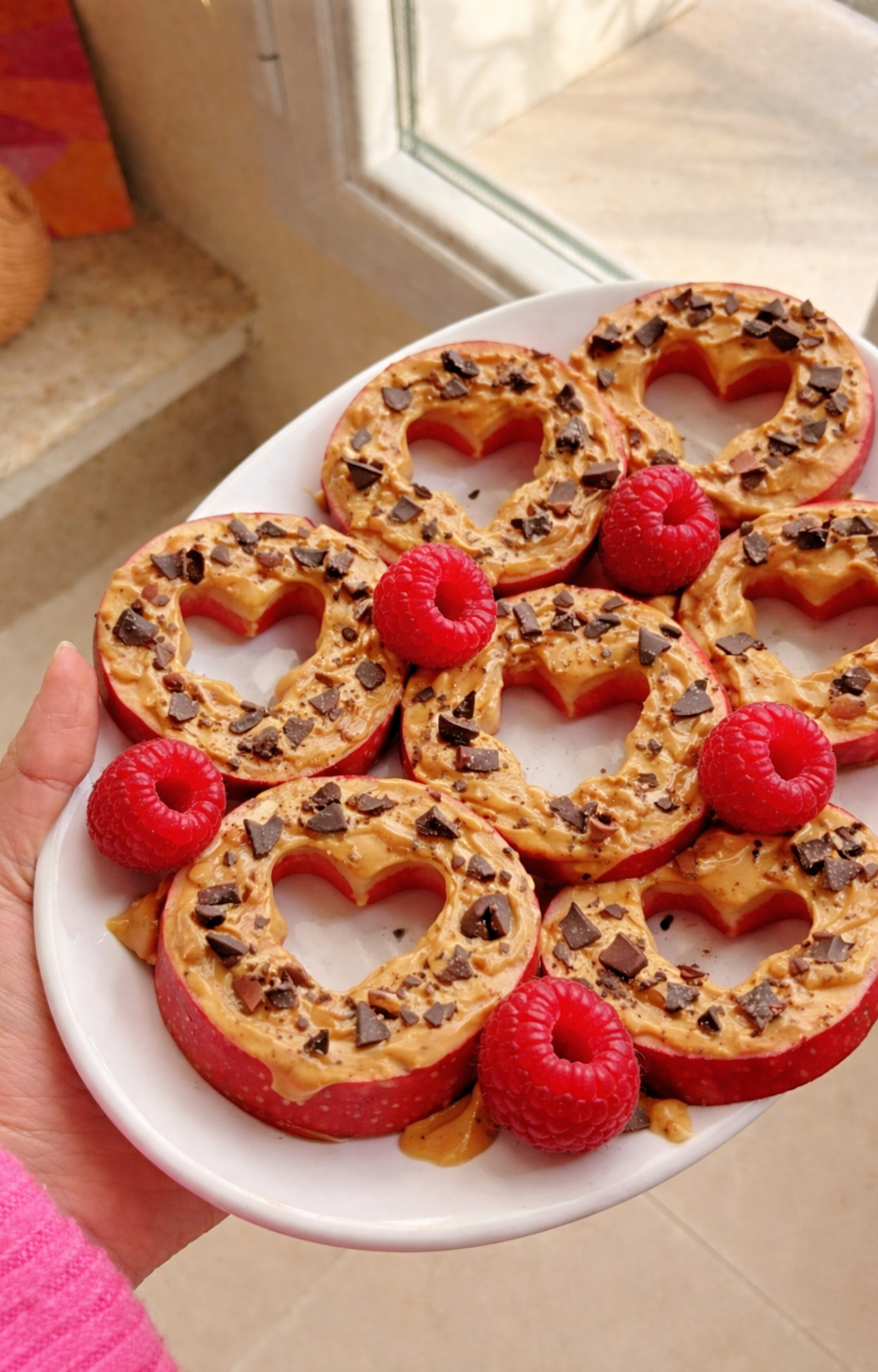 - Smeer daarna een dun laagje pindakaas op de appelschijfjes.
