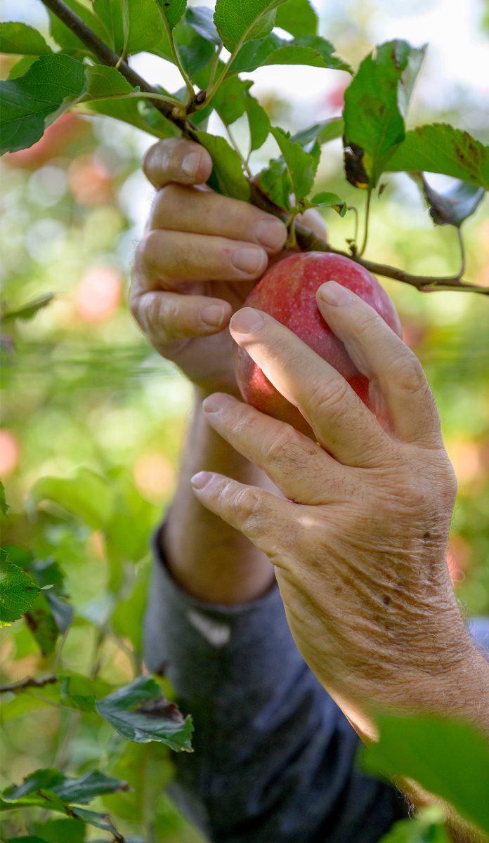 Pour préserver la qualité des fruits, la cueillette se fait uniquement par temps sec, du bas de l’arbre vers le haut, pour éviter que les pommes ne s’abîment en chutant les unes sur les autres.
